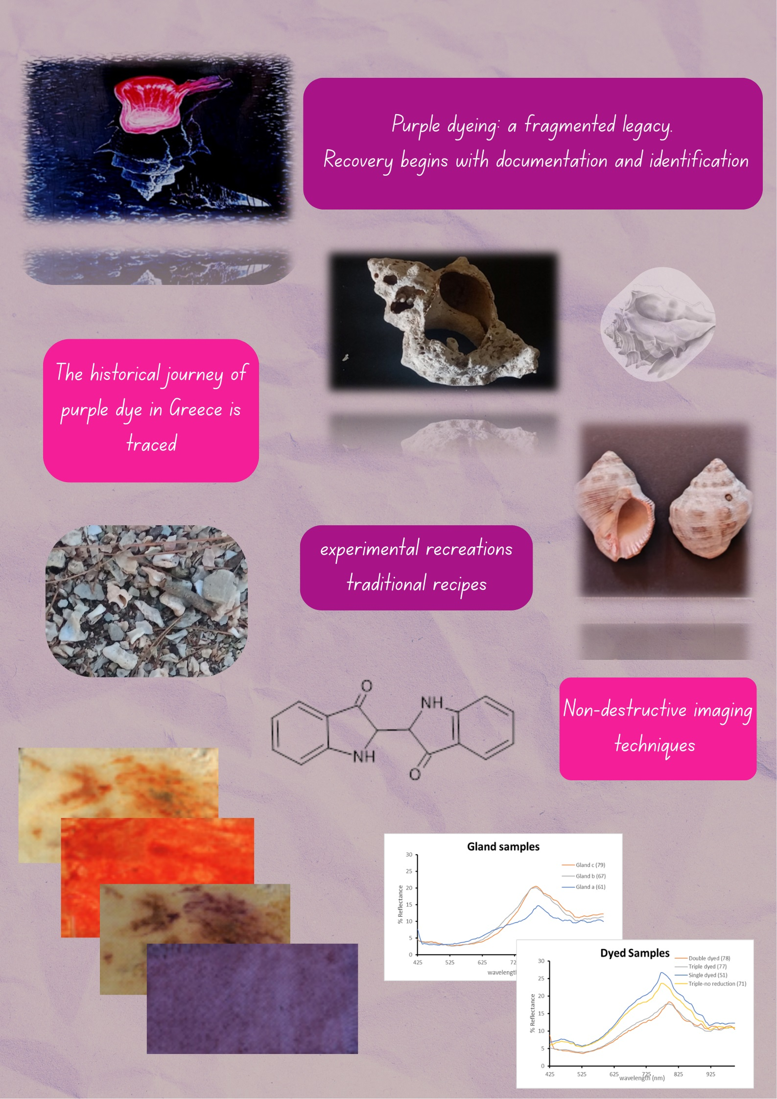 The objective of this study is to investigate the properties of Tyrian purple through the application of non-destructive imaging techniques on samples derived both from pure mollusk gland extracts and traditional dyeing recipes from the Greek region. In parallel, historical research into the dye’s production and use is essential to contextualize its cultural and technological importance within the broader framework of Greek heritage.