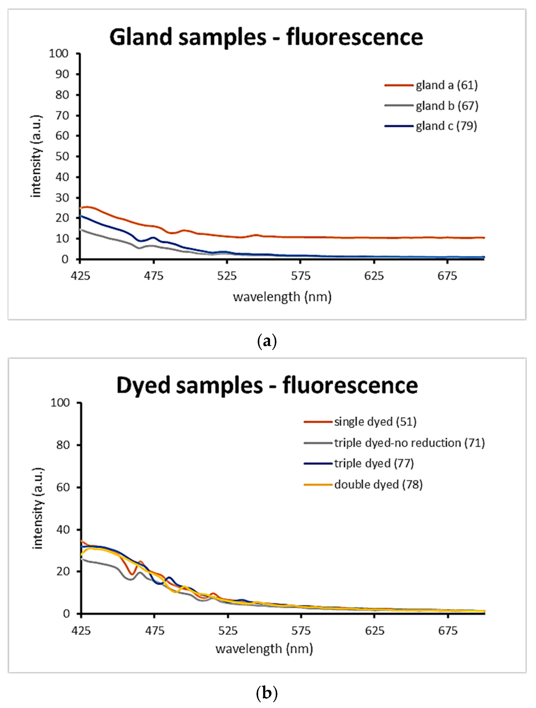 It is important to note that, in general, Tyrian purple samples do not exhibit high fluorescence intensity, which is in accordance with the recorded UVL images. The morphology of the curves is representable of the deep dark bluish purple fluorescence color that has been observed in the corresponding fluorescence images. The gland-applied samples demonstrated low fluorescence levels, which can be attributed to the localized and highly concentrated pigment areas. This concentration likely limits the uniform excitation and emission of fluorescence across the sample surface.