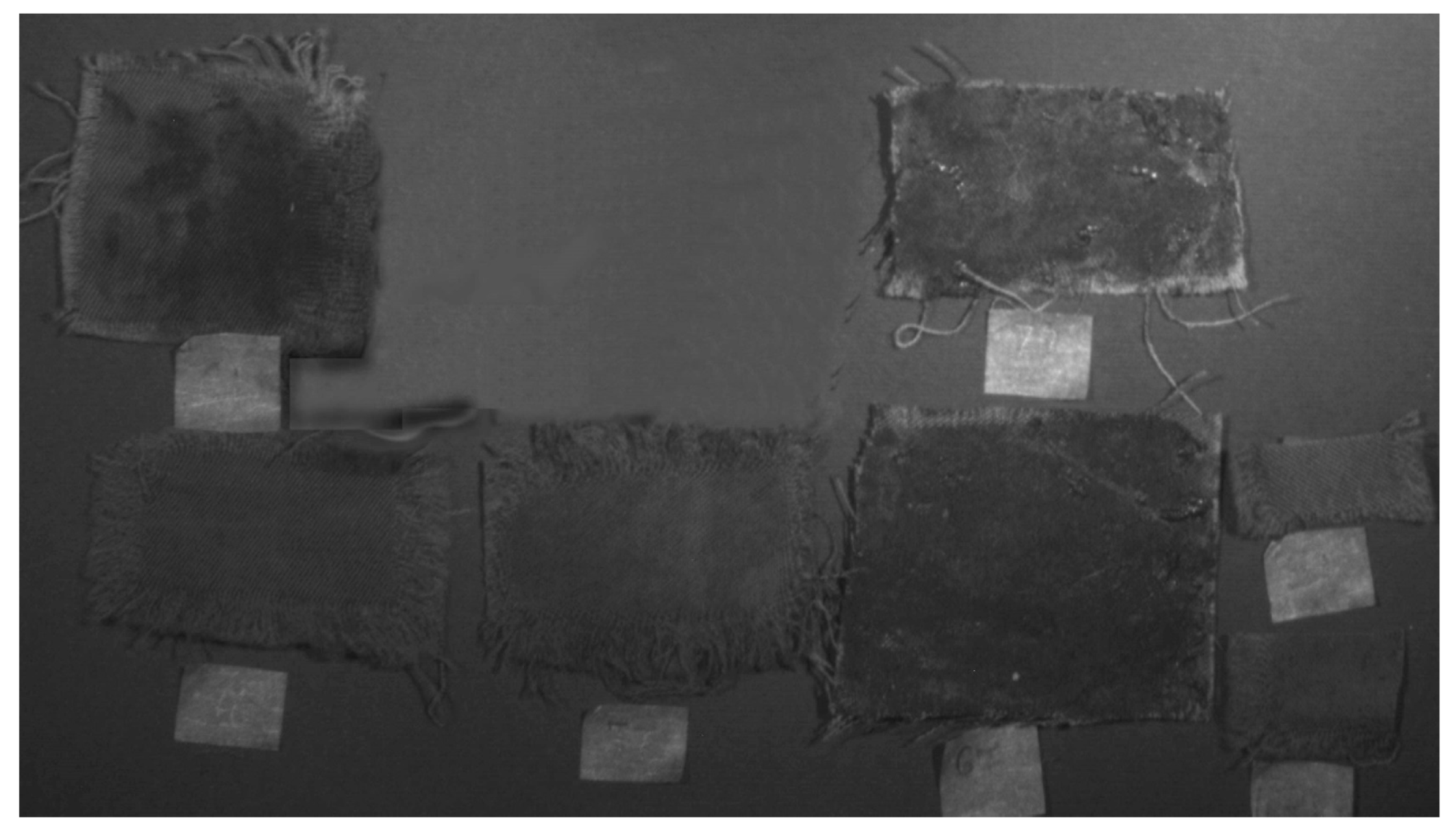 Visible reflectance imaging was carried out using a Nikon D800 digital single lens reflex camera (DSLR) equipped with an AF-S Nikkor 24–70 mm 1:2.8 G ED lens. A copy stand was employed to support the textile samples. Two J78 halogen lamps were used for symmetrical illumination.