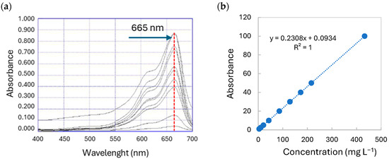 MB solution was prepared using distilled water and MB of analytical grade (Synth®,, Diadema, Brazil). The natural pH of the solution was determined to be 6.0. The absorbance was determined in UV–Vis (model K37-UVVIS from KASVI, Pinhais, Brazil) and a quartz container with 10.0 mm optical path using 665 nm wavelength (Figure 2a). Concentration was calculated using Lambert–Beer equation and data from calibration curve (Figure 2b). Absorbance was measured up to a maximum value of 1.0. For samples with concentrations exceeding this limit, the solutions were diluted prior to analysis, and both concentration and absorbance values were adjusted using the corresponding dilution factor.