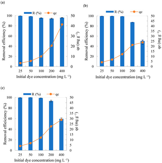 Evaluation of the effect of the initial concentration of MB on the parameters removal efficiency and adsorption capacity (qe) after 24 h of testing for samples (a) BTP-R, (b) BTP-300 and (c) BTP-500.