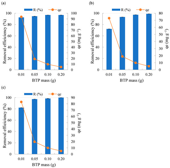 Evaluation of effect of BTP mass on the parameters removal efficiency and adsorption capacity (qe) after 24 h of testing for samples (a) BTP-R, (b) BTP-300 and (c) BTP-500.