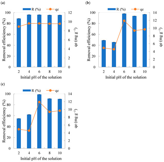 Evaluation of the effect of the initial pH of the solution on the parameters removal efficiency and adsorption capacity (qe) after 24 h of testing for samples (a) BTP-R, (b) BTP-300 and (c) BTP-500.