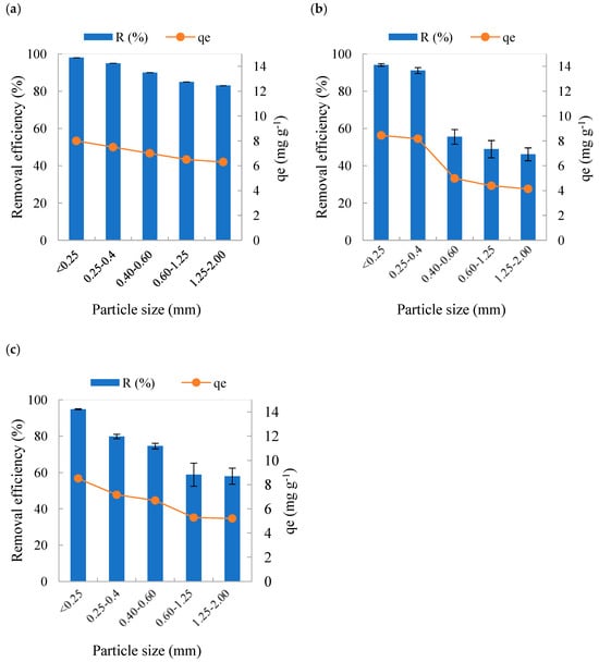 Evaluation of the effect of the particle size of the adsorbents on the parameters removal efficiency and adsorption capacity (qe) after 24 h of testing for samples (a) BTP-R, (b) BTP-300 and (c) BTP-500.