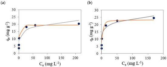 The adsorption capacity is associated with the number of adsorption sites present in the surface of the adsorbent. The analysis of adsorption mechanisms with new adsorbents is crucial for determining their application in water treatment. Typically, these mechanisms are assessed through conventional isotherm models, including Freundlich, Langmuir and Temkin [13,14,16,17]. The adsorption isotherm characterizes and predicts the quantity of adsorbed material as a function of pressure (or concentration) at a constant temperature [16]. The Langmuir model assumes homogeneous adsorption, while the Freundlich model is typically applied to studies of adsorption on multisite surfaces, whereas the Temkin model assumes a multilayer adsorption process [16].