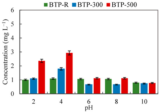 Desorption results are presented in Figure 8. MB desorption increased at lower (more acidic) initial pH values. This trend suggests that the adsorption process may be predominantly physical in nature, as indicated by the b parameter from the Temkin isotherm model. Among the materials tested, those subjected to thermal–chemical treatment (BTP-300 and BTP-500) exhibited higher adsorption efficiency and lower desorption rates—an advantageous combination for potential reuse of the adsorbents in multiple adsorption cycles. BTP-R presented high removal efficiency and low desorption rates, but it is subject to biodegradation.