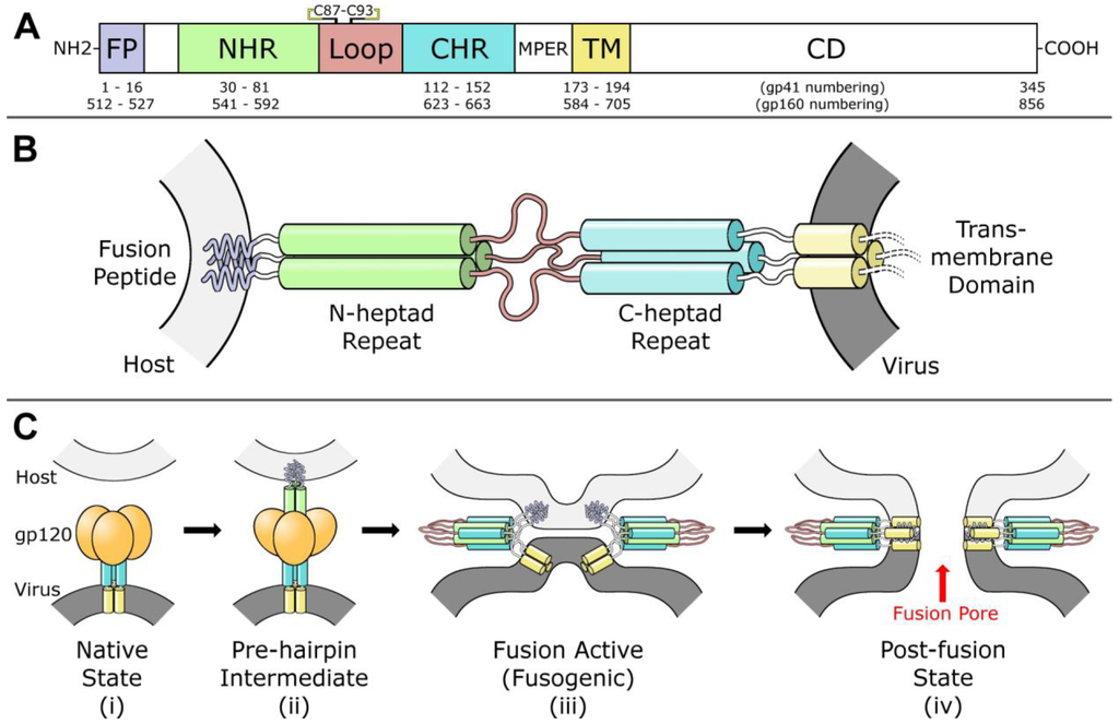 (A) Diagram of fusion protein gp41 sequence. From the N-terminus, the fusion peptide (FP), N-heptad repeat (NHR), loop region, C-heptad repeat (CHR), membrane-proximal external region (MPER), transmembrane domain (TM), and cytoplasmic domain (CD) are labeled. A disulfide bond between Cys 87 and Cys 93 in the loop region is indicated. (B) Model of gp41 trimer in the pre-hairpin intermediate conformation. In this model, gp41 spans from the host membrane (light gray) to the viral membrane (dark grey). Regions are colored according to the diagram in part (A). Cytoplasmic domain is omitted. (C) Model for gp41-mediated membrane fusion. In the native state (i) and the pre-hairpin intermediate (ii), gp120 receptors and co-receptors are omitted for clarity. In the fusion active state (iii) and the post-fusion state (iv), gp120 is omitted for clarity, and a second six-helix bundle is shown to illustrate cooperativity in forming the fusion pore. Red arrow indicates fusion pore. Concept for Figure adapted from Chan et al. [].