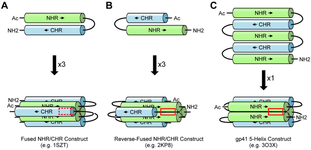 (A) In a fused NHR/CHR construct, the loop region is replaced by a short linker and the peptide trimerizes in solution, forming a six-helix bundle. In this structure, the conserved deep pocket is sterically blocked by a CHR peptide (dashed red box). (B) In the reverse-fused NHR/CHR construct, a truncated CHR peptide is linked N-terminal to the NHR. In solution, it will trimerize and the pocket is exposed (red box). (C) In the gp41 5‑helix construct, three NHR peptides and two CHR peptides are alternatively connected with short linkers. The construct folds into a five-helix bundle structure in solution leaving one NHR-groove and pocket exposed (red box). Arrows indicate peptide-bond direction from N-terminus to C-terminus.