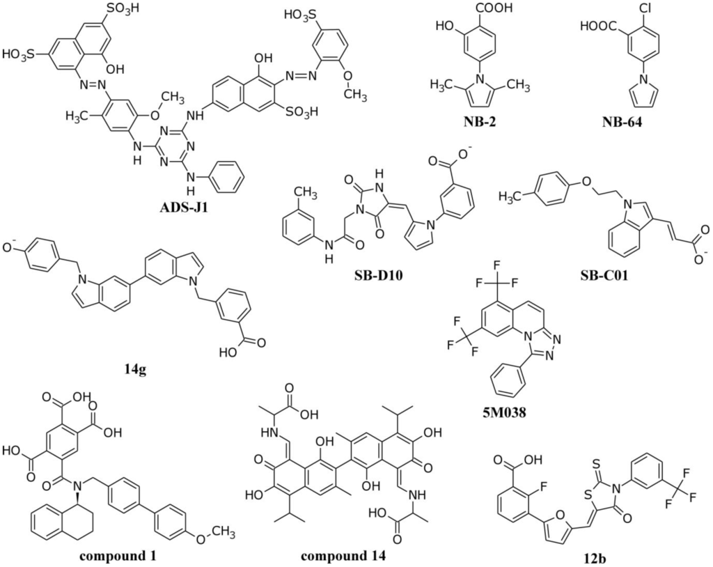 Representative chemical structures with reported gp41-binding activity. (ADS-J1 []; NB-2, NB-64 []; SB-D10, SB-C01 []; 14g []; 5M038 []; compound 1 []; compound 14 []; 12b []).