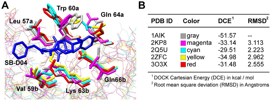(A) Docked pose of compound SB-D04 (blue) [] in PDB structure 1AIK (gray). Structures 2KP8 (magenta), 2Q5U (cyan), 2ZFC (yellow), and 3O3X (red) are overlaid. (B) DOCK energies and RMSDs associated with energy-minimized SB-D04 in complex with different PDB structures.