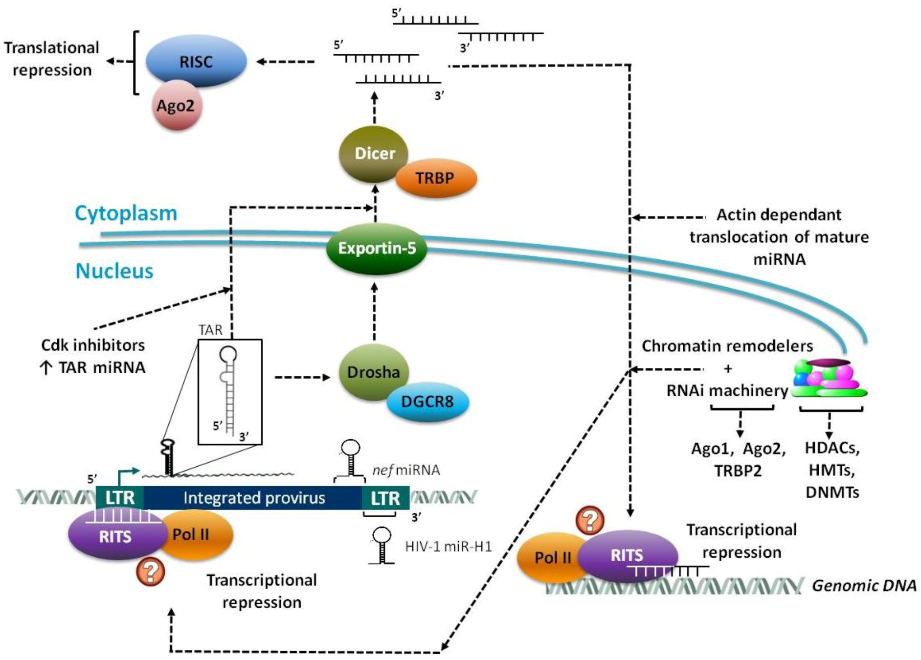 Several pri-miRNAs transcribed from the integrated viral genome are processed by Drosha and DGCR8 into pre-miRNAs. The pre-miRNAs are then exported to the cytoplasm via Exportin 5 where mature miRNAs are generated by Dicer. These miRNAs can either be incorporated into the post-transcriptional repressive RNA induced silencing complex (RISC) complex in the cytoplasm or translocated back into the nucleus in an actin dependent manner. In the nucleus, the miRNAs join the RITS complex that then establish transcriptional gene silencing (TGS) by targeting host genome or integrated viral promoters and rapidly recruiting repressive chromatin remodelers.