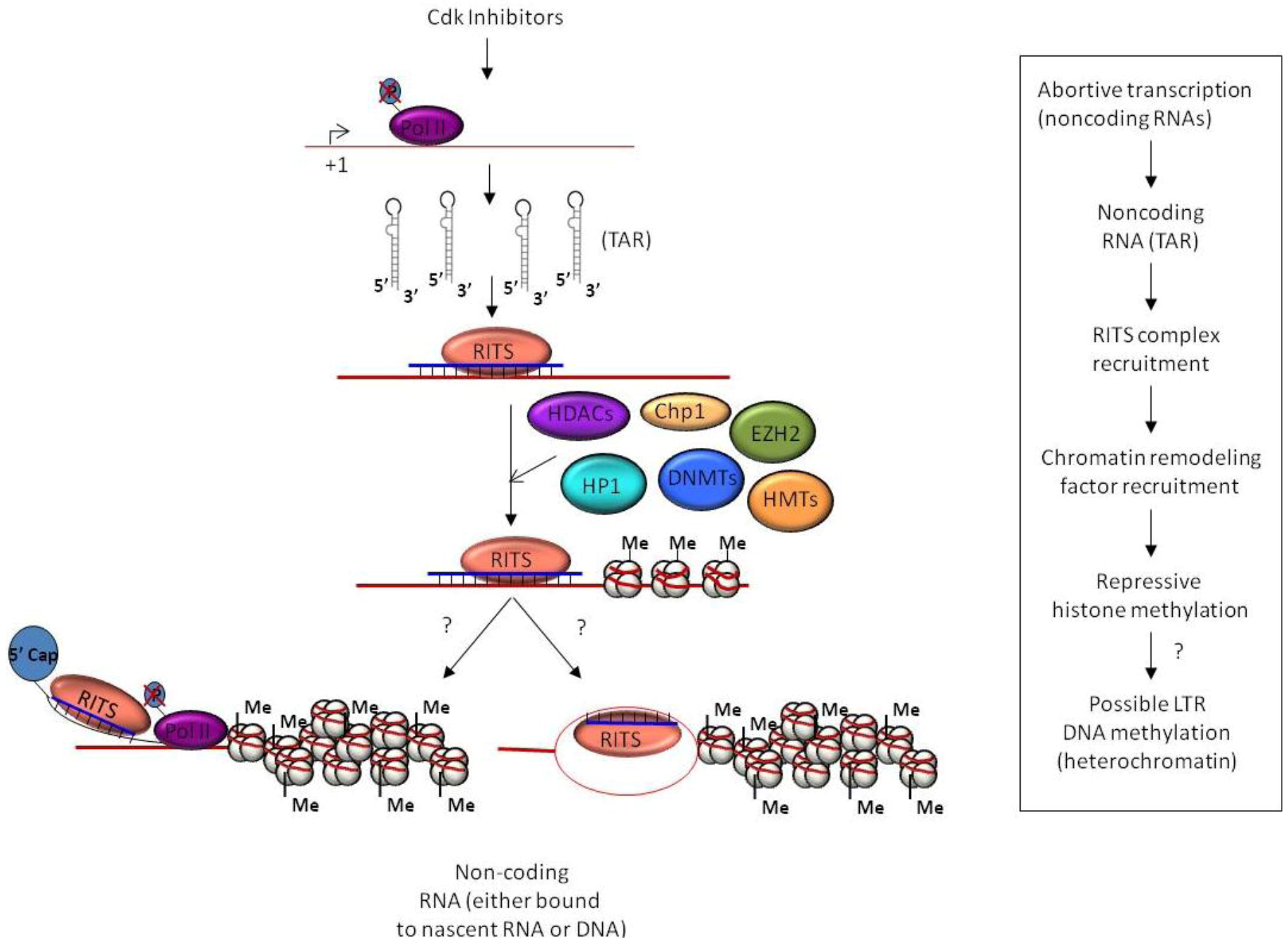 Pol II with hypo-phosphorylated C-terminal domains (CTDs) leads to short abortive transcripts from the integrated HIV-1 LTR, primarily TAR stem-loops. These high copy TAR transcripts are processed into miRNA that assemble with the RITS complex and, subsequently recruit repressive chromatin remodelers. The repressive HDACs, HMTs, DNMTs and other remodelers generate heterochromatin at the LTR and thereby establish viral latency. The use of Cdk inhibitors can increase the levels of un-processive Pol II complexes and, therefore, the levels of nascent TAR transcripts.
