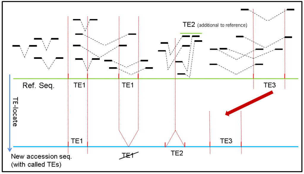 The new quantity of next generation sequencing (NGS) data allows the discovery of structural variations (SVs) per individual and even intra-individual [12]. As TEs are an important source of SVs, their exact movements and copy number are of interest (e.g., studies [13,14,15,16]). One pitfall of TEs is their high sequence similarity, which causes alignment difficulties, especially for the short reads of most NGS platforms. This issue runs like a common thread beside the main method and analysis in this paper.
