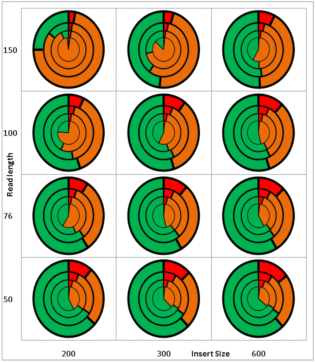 Results of TE-Locate with a virtual genome with known TEs. The X-axis denotes different insert sizes; the Y-axis denotes different read length; the concentric circles denote different coverage: from inner to outer circles, the coverages are 2×, 5×, 10× and 20× respectively. The red, orange, and green colors denote the proportion of false positives, false negatives and the rest. Here the false positive is defined as the ratio between false calls and all calls, the false negative is defined as the ratio between missing calls and all TEs inserted.