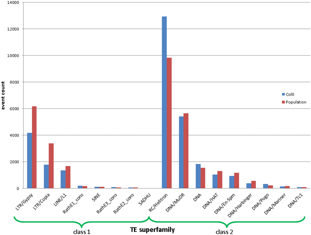 In total, we called about 40,000 TEs in the population on the superfamily level (on other hierarchical levels, it called other quantities of events). By contrasting the number of TE events called and that are annotated in the reference, we see a clear difference between Class I and II (“copy-paste” and “cut‑paste”) TEs (see Figure 4).