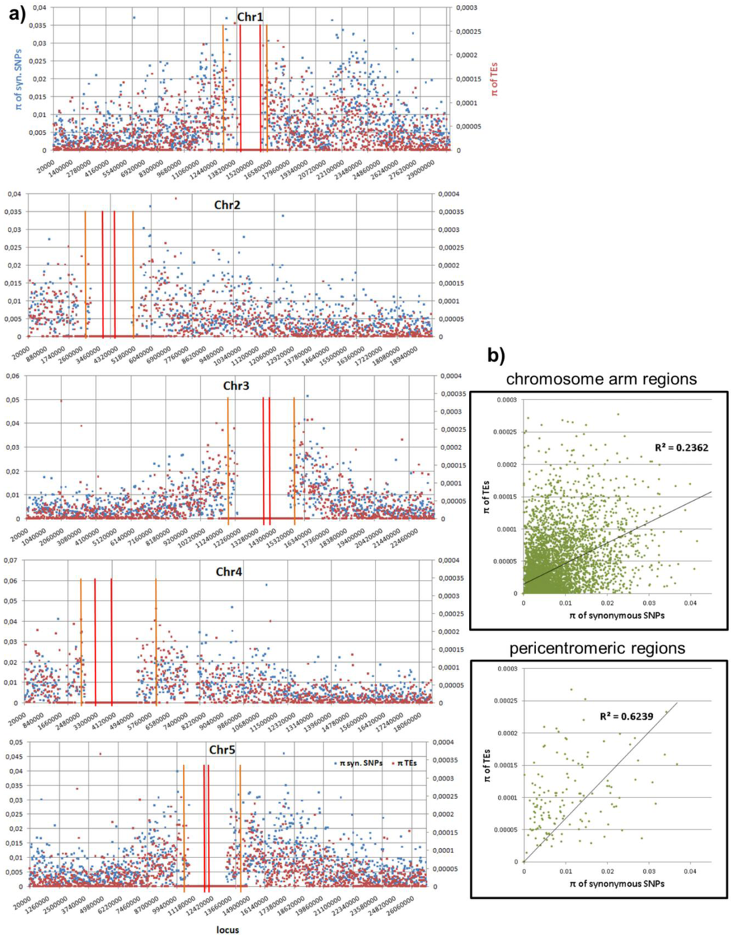 For comparative purposes, the distribution of polymorphism in terms of pair-wise difference, p, is shown in Figure 5 for TEs and for SNPs. We found that the polymorphism of SNPs is correlated to the density of new TEs (Figure 5b) in both chromosomal arms and pericentromeric regions, which might indicate an interesting mutation or selection mechanism, if not simply an effect of a deeper coalescence time.