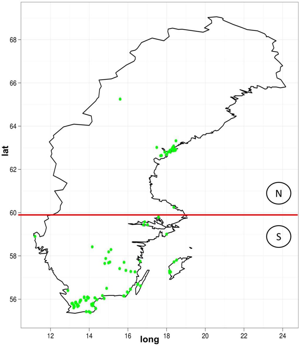 The geographic distribution of the Arabidopsis thaliana lines used for our analysis. The red line indicates the border between the later-used north and the south class.