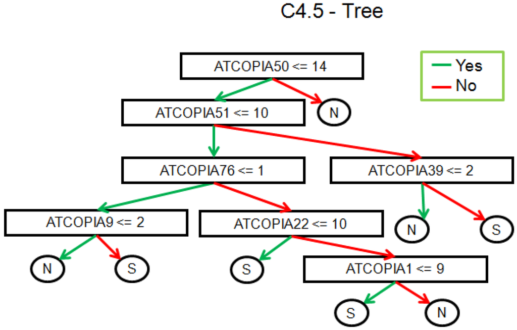We also looked for the distribution of the copy numbers to the geographic location. The sequenced samples were divided up between the north and south of Sweden (Figure 6). The question here is whether this classification could be replicated by observing the TE variations. Based on TE-Locate results, we tried several machine learning techniques (with Weka [26]). On the superfamily level there was no result better than chance at 10× cross-fold validation. On the TE-family level, there are good classifications with a true prediction rate of 92%–98% and a lower limit i.e., zero ratio of 71% (zero ratio = the ratio of the more frequent class). The result of the C4.5 algorithm [27] is shown in Figure 7. With respect to the true prediction rate, this is not the best model, but trees are easier to interpret than, for example, the weights of SVMs (Support Vector Machine) [28]. As one can see in this tree, although all TE‑families were used as variables, only Copia families are enough to sufficiently split the classes. We did not go into detail on why the copy numbers of Copia families are clearly different between north and south; the simplest explanation could be merely a temperature dependency in them (see the related, but not so recent [29,30]).
