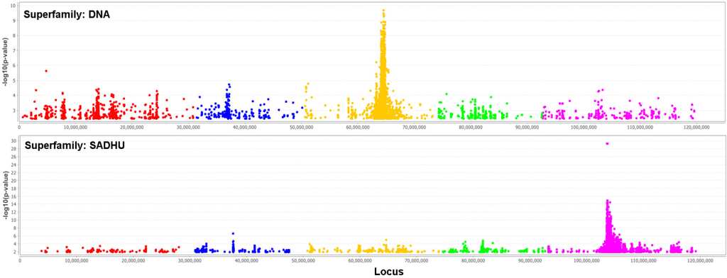 Manhattan plot of logged p-values of association between the SNPs and the TE copy number. The chromosomes are sequential in different colors. The upper plot uses the DNA TE-superfamily as phenotype, the lower the TE-superfamily SADHU. The Bonferroni threshold is 2.5 × 10−7.