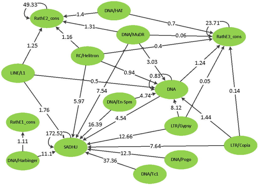 The SNP to copy number hierarchy from GWAS. The arrows indicate that the SNPs located in the superfamily on the blunt side of the arrow are significantly associated with the copy number of the superfamily on the side of the arrowhead. The number within the arrow is the number of SNPs normalized by the total length of TEs in the corresponding superfamily. There were no cases of arrows traveling in both directions.