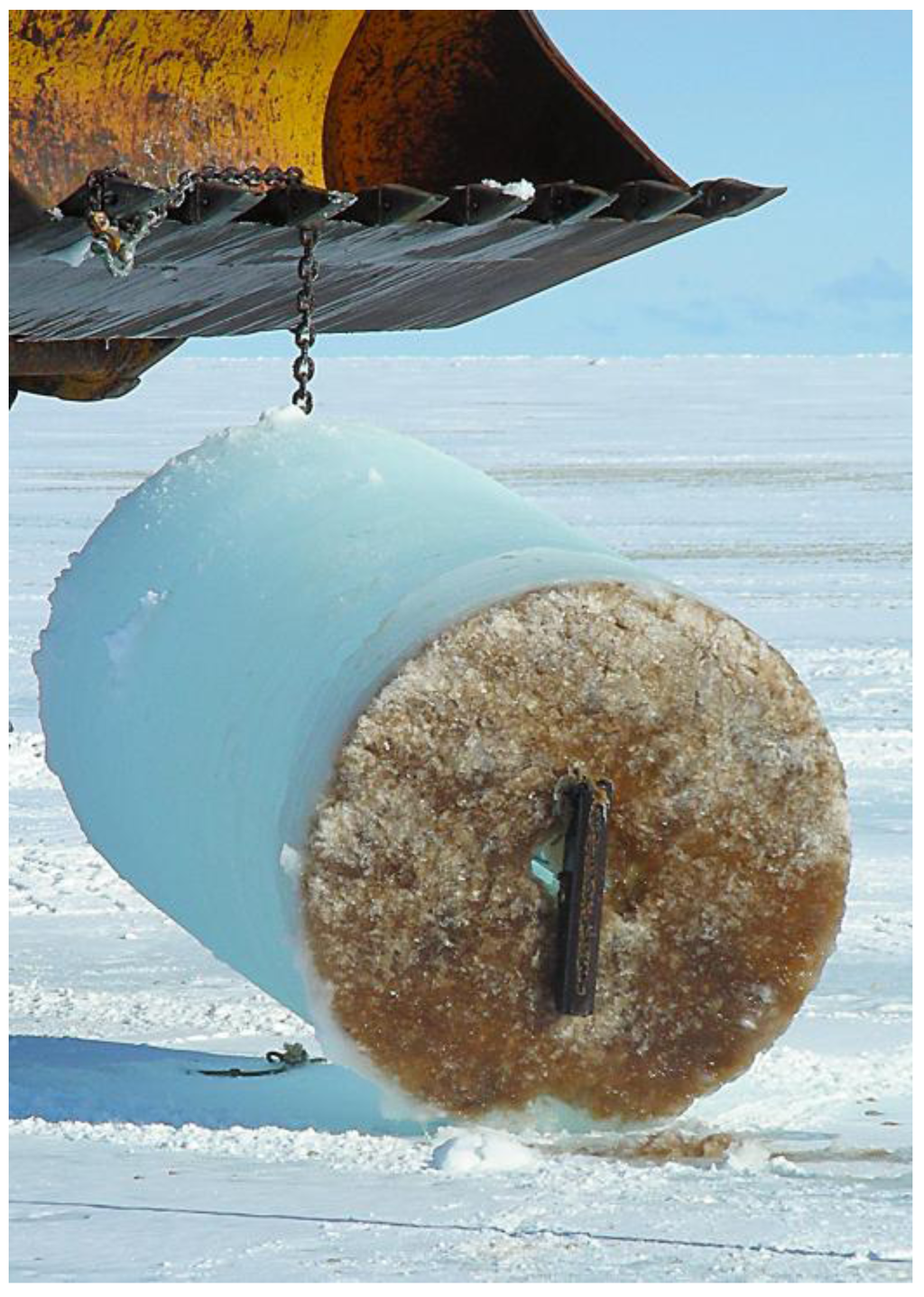 Cross-section of sea ice. A distinct brown coloration is present at the bottom 20 cm of a 1 m diameter section of sea ice. This is due to the high concentration of bacteria and microalgae within the sea ice.