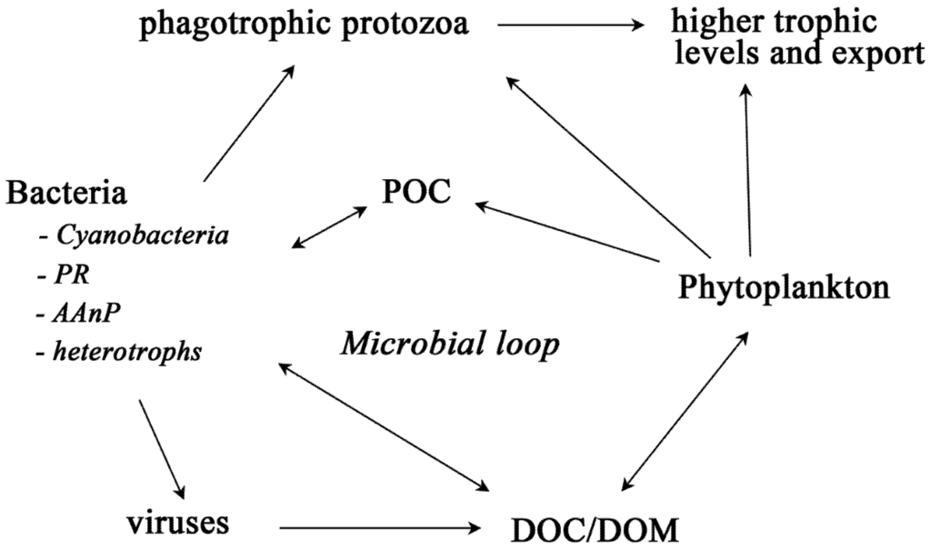 - Pomeroy, L.R.; Williams, P.J.I.; Azam, F.; Hobbie, J.E. The microbial loop. Oceanography 2007, 20, 28–33. [Google Scholar] [CrossRef]