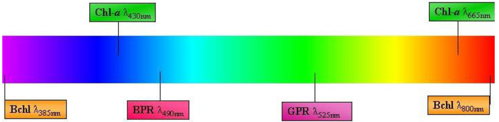 Phototropic metabolism is a feature of four other eubacterial phyla (i.e., Proteobacteria, Chlorobi, Chloroflexi and Firmicutes). Unlike cyanobacteria, these phototrophs utilize the most ancient form of photosynthesis: anoxygenic photosynthesis [62]. This pathway is important for nitrogen-fixation, and cells with bacteriochlorophyll (bchl) also play an important role in the microbial loop [63,64]. The presence of highly diverse anoxygenic phototrophic bacterial communities in marine environments now suggests that non-chlorophyll-a phototrophy may be a more common life history strategy than previously realized. For example, the Proteobacteria contain the largest group of anoxyphototrophs [65], which were thought to be strictly anaerobic until three decades ago when the first aerobic representative was identified [66]. In both aerobic and anaerobic taxa, bchl-a is the primary light-harvesting pigment and absorbs red light at 770 to 880 nm and blue light at ~385nm [67,68,69]. This provides a useful contrast to the chlorophyll-a present in cyanobacteria and algae, which absorbs at 430 nm and 665 nm (Figure 3).