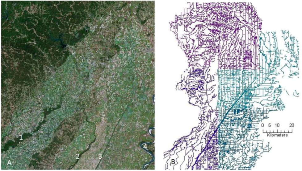 (a) Satellite photo showing the intersection of the Mississippi Alluvial valley and the eastern foothills of the Ozark Mountains on the border of Missouri and Arkansas, USA. The Black River (1, lower left) and the Saint Francis River (2, center) both have headwaters lying in the Ozark foothills at the top left, as well as in Crowley’s Ridge, the semi-forested area between the two rivers. The historic floodplains of their tributaries are clearly visible as non-forested pasture among the foothills. What remains of the Little River (3) is seen as a straight line between the Saint Francis River and the Mississippi River (4, bottom right corner). Much of the source water for both the Black and Saint Francis originates in closed canopy forest, and there is a high percentage of stream canopy coverage in the upland areas pastures. In contrast, the row cropping agriculture predominant in the lowlands creates a treeless landscape. The different colored specks are each individual fields bordered on at least two sides by a drainage ditch. (b) Stream diagram of the right half of Figure 1A, showing perennial streams between the Saint Francis River and the Mississippi River. The familiar dendritic and pinnate stream patterns at the top of the image changes to a trellis pattern of drainage ditches reflecting the change in topology and related increases in land use intensity.