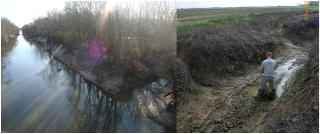 Agricultural drainage can cause stream incision at multiple spatial scales. At left, the Loosahatchie River, north of Memphis, Tennessee, USA. Channelization has resulted in stream incision, not only of the main channel, but also of tributaries, as seen by the difference between the water level and top bank of the stream flowing into the main channel. At right is an agricultural drainage ditch near Yazoo City, Mississippi, USA. Although the channel is sinuous, high peak flows have resulted in bed degradation and mass wasting. Although this photo was taken shortly after a substantial rainfall event the channel holds little water.