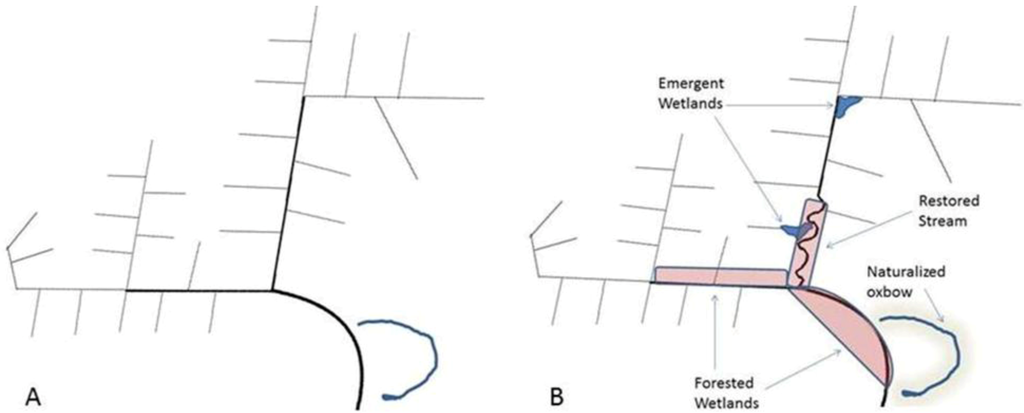(a) Schematic of a standard agricultural drainage system representing approximately one hectare. Primary streams (i.e. – edge of field ditches) are cropped to the edge or bordered by grass buffer strips. Higher order streams may have riparian trees, depending upon climate and agricultural management. The system is designed solely to convey water. (b) The same drainage following extensive restoration. Wetland and stream restoration in systems impacted by agriculture strategically put effort into restoring wetlands in areas that are marginal for agriculture and into increasing sinuosity and floodplain width in second and third order streams. Management practices range from simply ceasing agriculture in flood-prone areas to planting and promoting desired plant species using prescribed floods and drawdowns. Extensive earthmoving is often a prerequisite if the streams are disconnected from their floodplains or for the intensive water level management recommended for wildlife habitat. Often, even highly engineered restoration projects meet with only moderate success due to infrequent hydrologic connectivity or geomorphic instability caused by high discharge events. Although a large area is incorporated into the restoration plan, several kilometers of stream reach is upstream of the restoration influences.