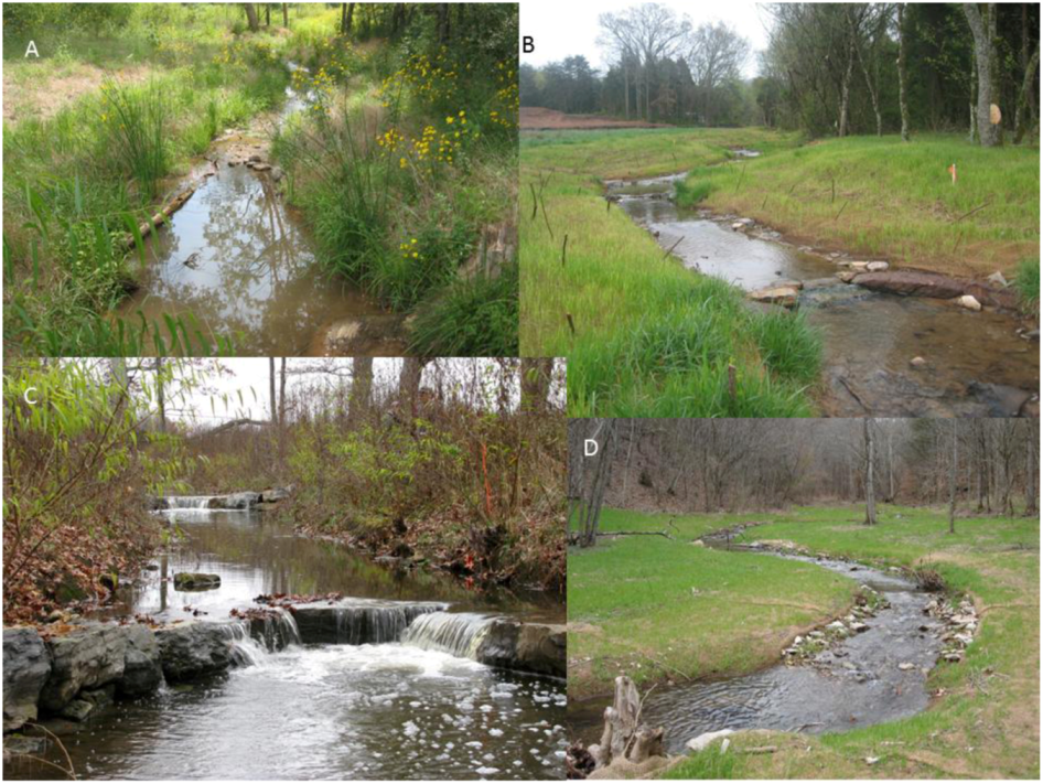 Structures used for stream restoration. A. A small log vane is used to stabilize the bank immediately upstream of a small constructed riffle. B. Cross-vanes are used for bed stabilization. Newly planted willow stakes line the bank and constructed mini-floodplain. C. Cross-vanes and established willow stakes. D. Root-wads, constructed riffles, and artificial meanders.