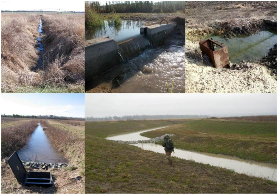 Various water control structures. Far left, downstream (top) and upstream (bottom) of a weir integrated into a ditch crossing on a farm on the Delmarva Peninsula, Maryland, USA (photos courtesy Dr. Tom Fisher). Top center, prefabricated slotted concrete weir in an experimental ditch system located on the campus of Arkansas State University. Top right, Flashboard riser with pipe draining into intermittent stream. Like the slotted concrete weir, boards can be added or removed to adjust the level of water retention. Although this structure is technically not located in a stream, it functions similarly in that it intercepts water in a channelized flow-path as opposed to sheetflow. Bottom right, demonstration ditch located near Yazoo City, Mississippi, USA. The terraces on the far bank are representative of a modified two-stage design, with the lower terrace being inundated during floods. This picture was taken during the rainy season. A smaller inset channel is not visible due to water depth. During the dry season the ditch is a series of shallow pools due to the presence of low-grade weir constructed of an earthen berms armored with rip-rap.