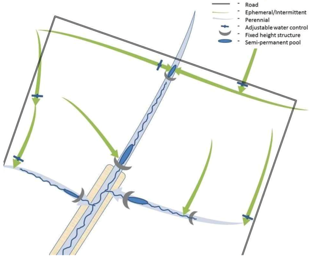 Other limitations are related to how the landscape impacts channel morphology. Attempts at rehabilitating ecological functions of drainage ditches must consider three related traits linked to channel morphology: gradient, substratum, and hydrology. Gradient and substratum are less subject to small-scale manipulation than hydrology, though no less important with regard to their impact on outcomes. In areas of essentially zero gradient, hydrology may be less dynamic than in low-relief ridge and swale landscapes. In areas like the Netherlands or Florida, ditches generally have consistent flow year round [,]. In contrast, in areas with even slight elevation gradients, such as the “Mississippi Delta” region of the United States, ditches experience drastic changes in hydrology, both seasonally and in response to precipitation events. Although channelization has been implicated as a factor in increased hydrologic variability, both comparative studies and conceptual models have also demonstrated the opposite trend [,,]. There are a number of potential factors that may explain why channels that have been altered to convey water have more persistent flow compared to unchannelized streams or stream reaches.