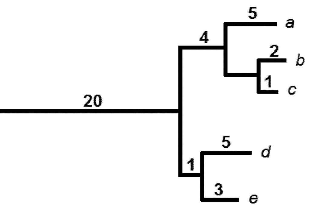 A hypothetical phylogenetic tree for species a through e. Branch lengths are shown above branches. The PD is 41 for this set of species (20 + 5 + 4 + 2 + 1 + 5 + 1 + 3). If species a was lost, 5 units of PD would be lost. Successive losses of species would imply PD losses of similar magnitude. However, the loss of the last species of the clade would imply that the deeper branch of 20 units is now lost as well.