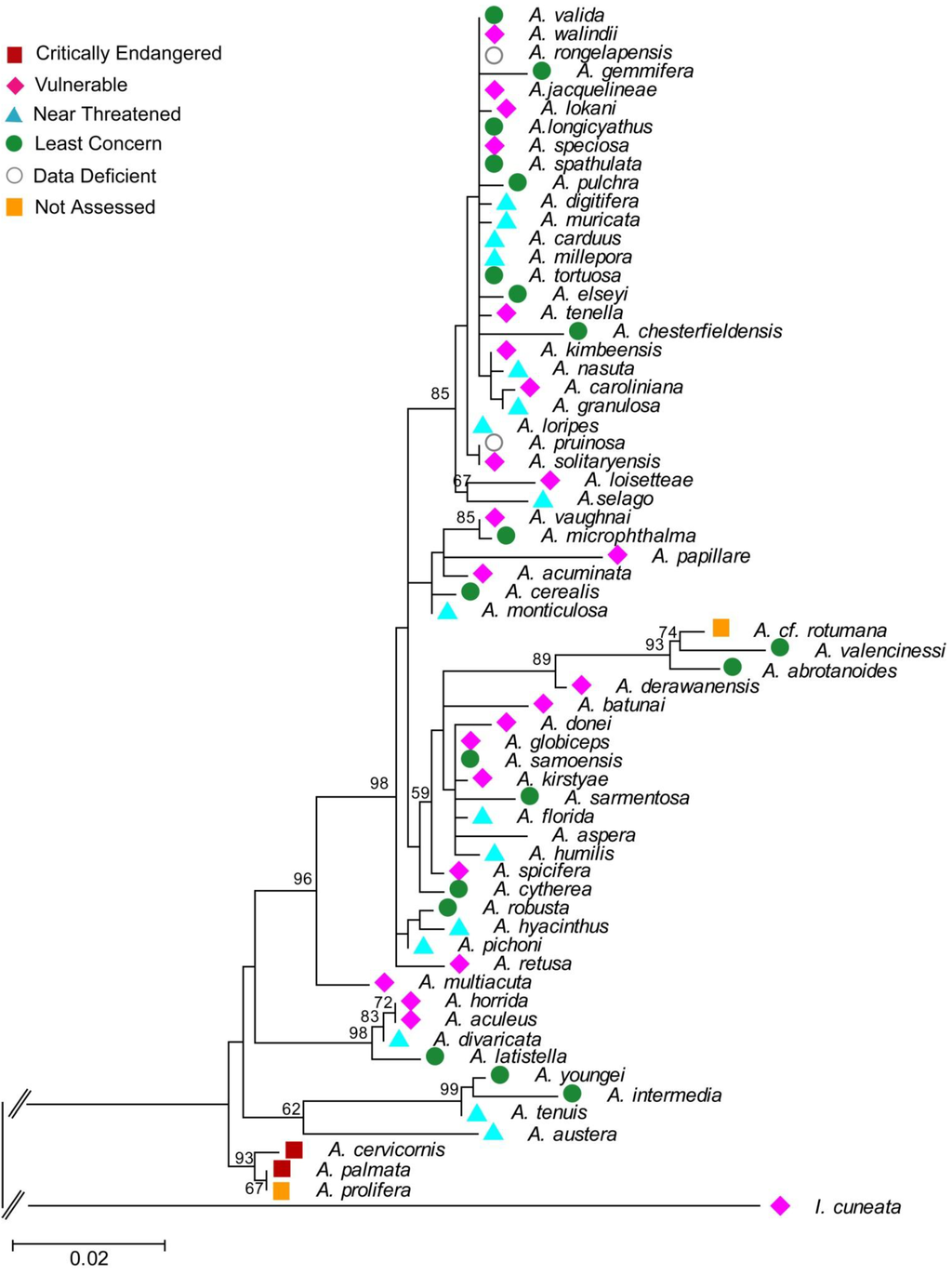 | Acropora pulchra (Brook, 1891) | EU918230.1 | [62] | aspera group | LC |
