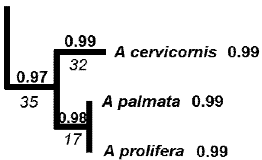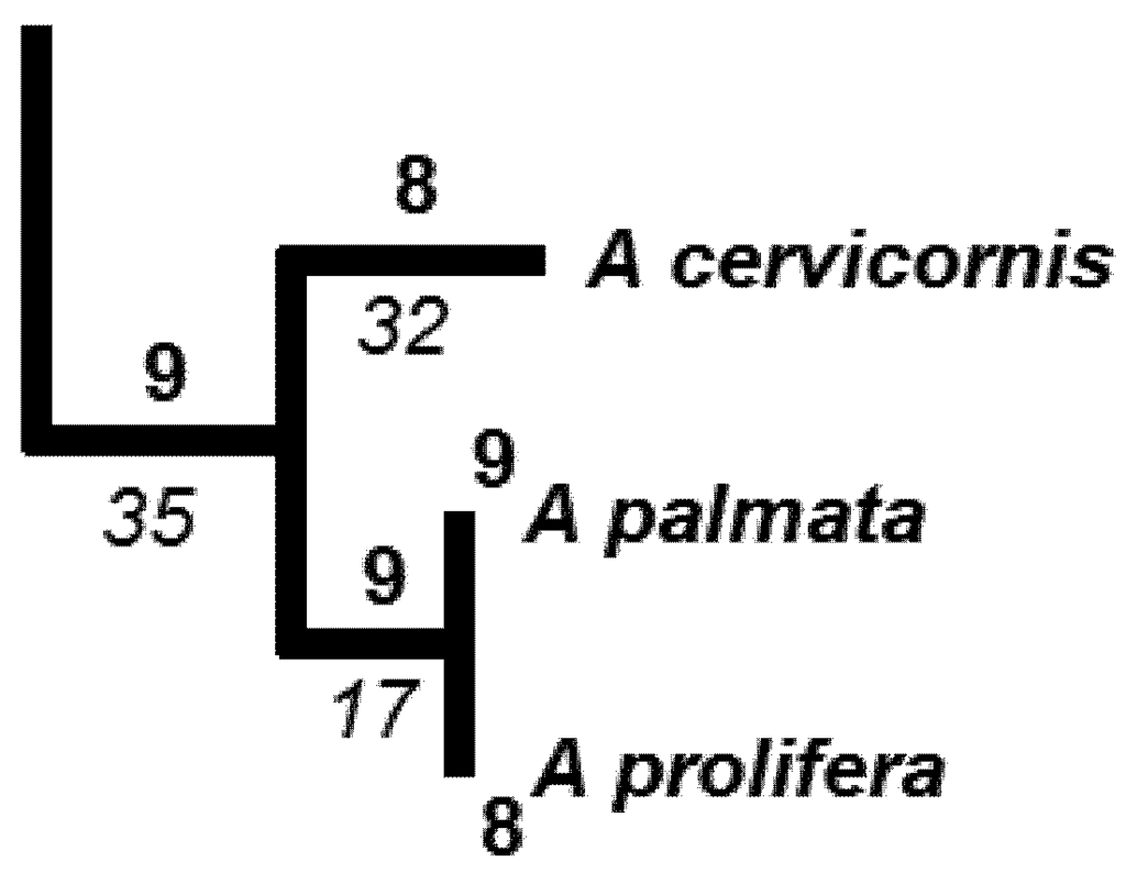 - Richards, Z.T.; Wallace, C.C.; Miller, D.J. Archetypal ‘elkhorn’ coral discovered in the Pacific Ocean. Syst. Biol. 2010, 8, 281–288. [Google Scholar]
