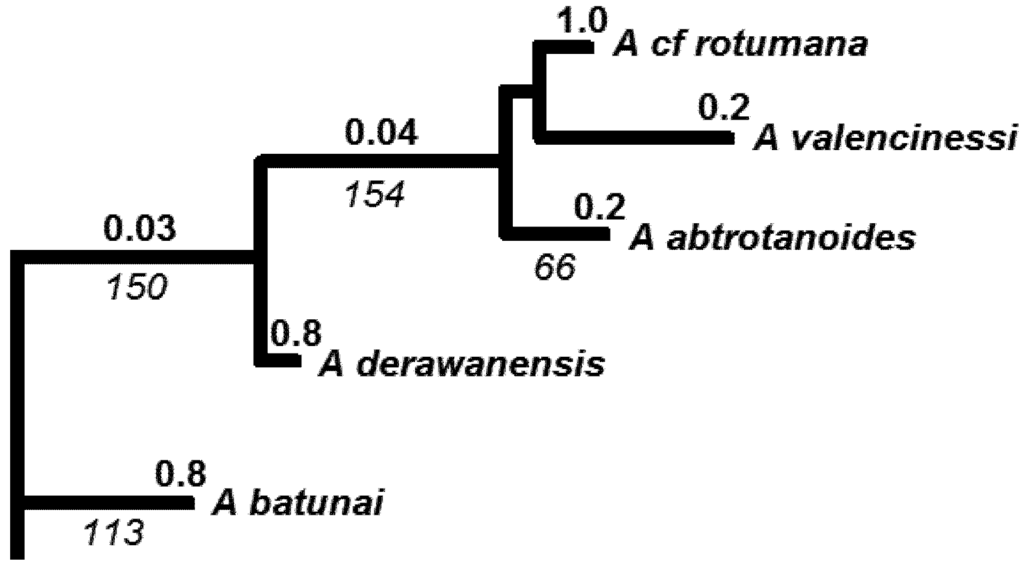 Currently, the morphological phylogeny portrays the rudis group to be the oldest living lineage and the echinata group to be the youngest [47]. However some fundamental differences are apparent with the published molecular phylogenies. For example, mitochondrial DNA suggests the Atlantic species—A. cervicornis and A. palmata are the basal lineage [60,61] rather than members of the rudis group, A. longicyathus occurs in a near basal position in the molecular phylogeny [60] despite belonging to the ‘most recently evolved’ echinata group [47]. Most Acropora phylogenies have included only common and widespread species, however the inclusion of rare species in a new phylogeny [62], suggest that not all rare species are recently evolved and hence, there is substantial risk that novel phylogenetic information will be lost if rare and threatened species are driven to extinction by the end of this century as predicted [23].