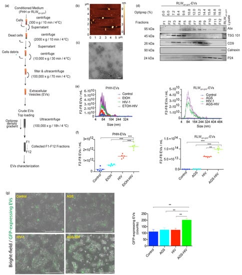 Ethanol (EtOH) stimulates EV release from HIV-infected hepatocytes. (a) Schematic demonstration of the process of extracellular vesicles (EVs) separation and OptiPrep density gradient method. (b) Topographic profiling of EVs, using atomic force microscopy (AFM) reveals a heterogeneous population of spherical particles of RLWXP-GFP cells. (c) Transmission electron microscopy of EVs derived from acetaldehyde-generating system (AGS)–HIV-infected RLW cells reveals a heterogeneous population of small EVs (<200 nm). Magnification 110,000× and scale bar 100 nm. (d) Representative immunoblotting images from AGS–HIV treated group show protein expression from F1-F12 fraction of EVs and RLWXP-GFP cells lysate for EV-associated proteins ALIX, TSG101, and CD9, small extracellular vesicle (sEV) negative marker calnexin, and HIV protein p24 enrichment in fractions F9-F12. (e) The size distribution of pooled EVs from F2–F8 fractions, released from primary human hepatocytes (PHH) EVs and RLWXP-GFP-EV by NanoSight and ZetaView, respectively. (f) Dot plots show the concentration of EVs released from EtOH treated HIV-infected PHH and acetaldehyde-generating system (AGS)-treated HIV-infected RLWXP-GFP cells EV by NanoSight and ZetaView, respectively. (g) AGS–HIV treatment in RLWXP-GFP cells induces more endogenous EVs, as compared to their respective controls. The bar graph shows quantification of EVs with Fiji software by counting GFP expressing EVs from five to nine randomly captured images with a fluorescence microscope at 10× magnification. Results represent the mean ± SEM. (e–g) Statistical significance between groups is indicated by asterisk(s) and determined by one-way ANOVA (*** p ≤ 0.001 and ** p ≤ 0.01).
