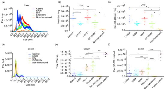 Hepatocyte-derived EVs in the liver and serum from liver-humanized and non-humanized mice. (a) The size distribution of hepatocyte-specific EVs for the size range 0.5–500.5 nm in the liver from humanized control, EtOH, HIV-1 and EtOH–HIV, and non-humanized mice. (b) Graph showing the concentration of total human hepatocyte specific EVs obtained from the livers. (c) Graph showing the concentration of EVs in the size range of sEVs (<200 nm) obtained from the livers. (d) The size distribution of human hepatocyte specific EVs in the serum. (e) Total human hepatocyte specific EVs in the serum. (f) The serum concentration of human hepatocyte EVs in the size range of sEVs. The single dot represents the concentration of EVs in one capture in NanoSight. Equal amounts of livers and serum from untreated and treated mice were used as the starting material to isolate total EVs. Non humanized mice served as a negative, and human serum as positive to the human-specific EVs. All conditions and dilutions were kept identical for all the treatment groups. NanoSight NS300 was used to assess concentration after adjusting for dilutions. Data for the control group were derived from the single control mouse and two pooled control mice. Non-humanized mice data were derived from pooled samples of three mice. Statistical significance between treatment groups is indicated by asterisk(s) and determined by one-way ANOVA (**** p ≤ 0.0001, *** p ≤ 0.001, ** p ≤ 0.01, and * p ≤ 0.05).