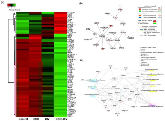 We examined the differentially expressed genes in EtOH–HIV treated PHH group, as compared to EtOH and HIV groups and identified upstream regulators that regulate genes associated with EVs biogenesis, oxidative stress, and lysosome-related diseases and functions. Sixty-three (63) differentially expressed genes in the EtOH–HIV group, including upregulated 50 and downregulated 13 genes, were identified by using DEGseq R package, and hierarchical clustering analysis was carried out with the log10 (FPKM + 1) of union differentially expressed genes of all comparison groups (Figure 3a). IPA upstream regulator analysis identified 193 significant upstream regulators (p-value < 0.05) in the category of ligand-dependent nuclear receptor (1), transcription regulator (109), kinase (31), and enzyme (52), and out of these categories, five (RORA, ZBTB16, RHOB, HNF4a, and FKBP5) were upregulated in the EtOH–HIV group. Association of these upstream regulators with their targets in the dataset is depicted in Figure 3b. Integration analysis of the upstream regulators with their targets, using toxicity and canonical pathways, revealed dysregulated downstream genes that are involved in the accumulation of oxidative stress (related to genes PIK3R1, FKBP5, CYP3A5, SOD1, CYP2E1, TSG101, GPX1, and TAT1), dysregulation of lysosomal function (CTSB, IL6, Rab27A, TSG101, Rab 7A, Rab11A, PIK3R1, LAMP1, and Rab5A) and EVs biogenesis as evidenced by regulating the pathways associated with phagosome formation (PIK3R1, ICAM1) clathrin-mediated endocytosis signaling (PIK3R1, Rab5A, TSG101, Rab7A, and Rab11A) phagosome maturation (LAMP1, Rab 7A, and Rab11A), and caveolar-mediated endocytosis signaling Rab 5A (Figure 3c).
