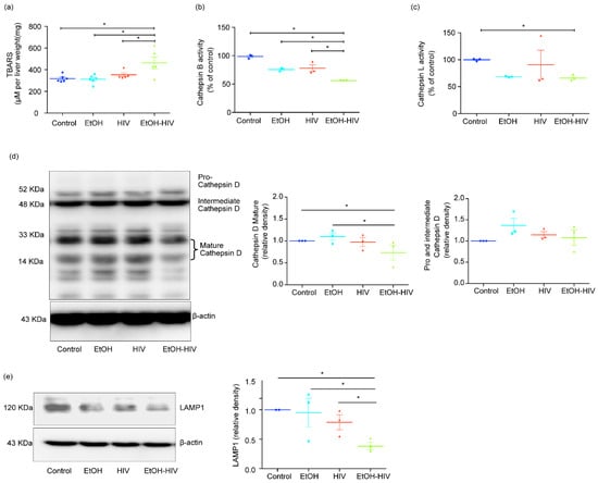 In hepatocytes, the decline in cathepsin activities by ethanol metabolism has been reported before and was linked to oxidative stress induction [5]. Our lab also demonstrated earlier that EtOH and HIV treatments could induce oxidative stress in the liver in vivo [5]. Similarly, we noticed a significant increase in the activation of oxidative stress in humanized mice’s liver tissues when assessed with the TBARS assay (Figure 5a). In line with our findings in vitro, we also observed significant inhibition in the activity of cathepsin B and cathepsin L in the liver tissue of mice exposed to EtOH and HIV, as compared to HIV and control groups (Figure 5b,c). Cathepsin D maturation is regulated by the activity of cathepsin B and L, so we checked the expression of pro–cathepsin D and mature cathepsin D, produced in the biosynthetic pathway as a precursor pro–cathepsin D (~52 KDa or intermediate cathepsin D ~48 KDa) and sorted to the endolysosomal compartment, where it is processed into a mature form (~34 and 14 KDa) at acidic pH. EtOH-fed and HIV infected mice group showed a significant decrease in mature cathepsin D expression, as compared to control mice (Figure 5d). We observed a significant increase in the EtOH and a trend of an increase in the expression of pro– and intermediate cathepsin D in other treatment groups, which showed no significant difference from mice fed with the control diet (Figure 5d). Besides, LAMP1 expression was significantly downregulated in EtOH-fed HIV-infected mice (Figure 5e).