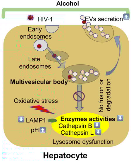 Alcohol stimulates EVs release from HIV-infected hepatocytes by impairing lysosomal function. The maturation of early endosomes results in the formation of late endosomes/multivesicular bodies (MVBs). MVBs that contain many intraluminal vesicles either release EVs by fusion with the plasma membrane, or their contents are degraded if they fuse with lysosomes. Alcohol increases oxidative stress, and lysosomal pH suppresses lysosomal enzyme activities and LAMP1 protein expression in HIV-infected hepatocytes that impair the fusion or degradation of multivesicular bodies to the lysosome, finally leading to an increase in EVs’ release.