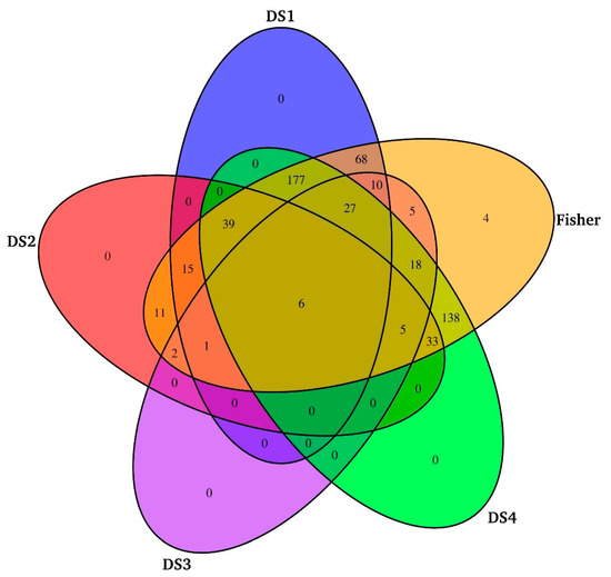 Following the DE analysis of each individual dataset, we used the Fisher method and identified 3574 DETs across all four datasets. From this list, we first selected only those transcripts that exhibited an average fold change of ≥2 (log2FC ≤ −1 or log2FC ≥ 1) and an adjusted p-value of <0.05. This resulted in 1748 DETs, of which a large number of transcripts (~1300) were further excluded from the analysis because of their inconsistent or conflicting expression patterns. Such inconsistent transcripts were upregulated in some studies and exhibited downregulation in others. Therefore, only those transcripts that showed consistent expression in the four datasets were considered as DE (Figure 1).