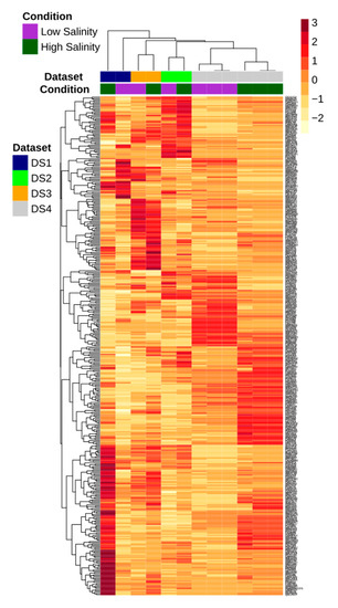 Heatmap showing differentially expressed transcripts identified by meta-analysis in the gills transcriptome of four different Chinese mitten crab (CMC) datasets under salinity. Only transcripts with an average fold change (FC) of ≥2.0 and a Benjamini-Hochberg adjusted p-value of <0.05 were considered to be differentially expressed.