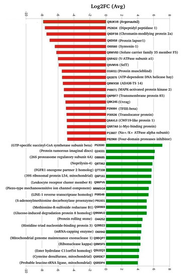 In addition to the above-mentioned families, there were nine additional TC 1.A families, each represented by only one representative on the list of transporters found in this work (Table S6). Among these, five were downregulated, representing the families 1.A.79 (SID1 transmembrane family member 1), 1.A.33 (Endoplasmic reticulum chaperone BiP), 1.A.21 (Bcl-2-related ovarian killer protein), 1.A.13 (Calcium-activated chloride channel regulator 2), and 1.A.101 (Peroxisomal membrane protein 11C), respectively. The Bcl-2-related ovarian killer protein was the most downregulated of all these five transporters. The Bcl-2 family is represented by apoptosis regulator Bcl-X and its homologs [71]. Such proteins play essential roles in apoptosis, the cell suicide program necessary for development, tissue homeostasis, and protection against pathogens.
