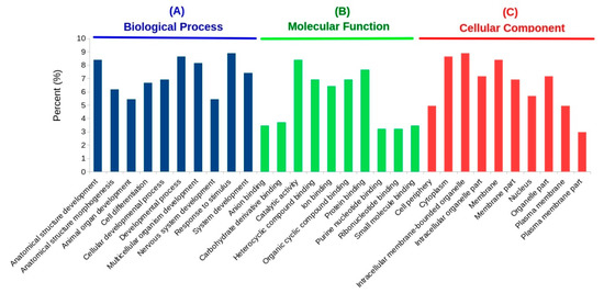 Using the ShinyGO tool, enriched GO categories associated with DETs were identified in terms of the biological process (BP), molecular function (MF), and cellular component (CC). Based on this analysis, the GO term “response to stimulus” was the most enriched biological process, followed by several others related to development, such as anatomical structure development, multicellular organism development, and system development (Figure 4A and Table S4). Besides the enrichment of various developmental processes, an interesting observation was that out of 30 topmost enriched GO biological processes, at least six were related to the nervous system and included nervous system development, neuron differentiation, the generation of neurons, neurogenesis, neuron development, and neuron projection development (Table S4). Reports have suggested that, during osmotic changes, the neuroendocrine system may modulate ion transport in the gill epithelium through neurotransmitter signaling [9]. One of the key enzymes that was identified to be downregulated in high salinity as compared to freshwater conditions in the meta-analysis was the alpha subunit of sodium/potassium-transporting ATPase (Na+/K+-ATPase). This enzyme was found to be part of various enriched biological processes, such as the response to stimulus and nervous system development, in the meta-analysis.