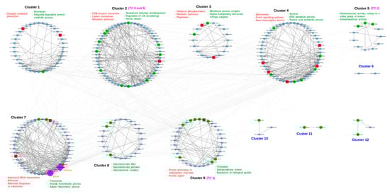 There is a growing interest in the application of biological networks to address important biological phenomena [53]. Network-based studies offer a framework to get a broad overview of data that includes several interacting groups. This potential of a community-based network analysis allows researchers to investigate and compare a diverse set of proteins and their interactions within the context of modules or communities identified in the network [54]. Therefore, we attempted to identify the modular structure of the interaction network and identified that the network could be divided into 12 modules or communities (clusters) (Figure 5). However, only eight modules with 10 or more nodes (genes) were identified by using the GLay implementation of the fast-greedy algorithm [55] within the clusterMaker [56] plugin of Cytoscape. The algorithm finds clusters by repetitiously discarding edges from the network and then looks again for the linked nodes [57]. We performed an enrichment analysis for each of these eight individual clusters to identify enriched GO terms and KEGG pathways associated with these modules. The number of nodes in each of these clusters ranged between 11 (cluster 5) and 60 (cluster 2), respectively. The enrichment analysis of all the clusters suggested that each of these clusters was involved in performing specific functional roles. For example, most of the enriched GO processes in the largest cluster 2 were related to morphogenesis, development, or differentiation (Figure 5 and Table S5). In contrast, the smallest cluster 2 was enriched with processes related to oxidoreductase or sulfurtransferase activities, including others. Many transporters were also found in almost every cluster; however, only clusters 2, 5, and 9 were enriched with different transporter classes (Figure 5).