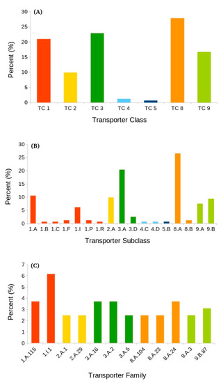 This subclass represents proteins that aid in transporting across one or more biological membranes but do not themselves take part in direct transport [19]. Such transporters consistently function cooperatively with well-established transport systems. Almost all the transcripts (43/45) assigned to TC 8 belonged to subclass 8.A, which also represented the most abundant transport subclass among all the identified subclasses (Figure 6B). These 43 transcripts were shared between 24 different families (Table S6).