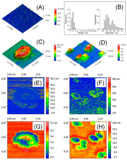 Figure 1A shows a large-scale AFM image of isolated EVs in air and their size distribution (Figure 1B). The HR AFM image of a single vesicle associated with exosome is presented in Figure 1C. The cup-shape effect was revealed and was a typical artifact of exosome measurements caused by mechanical indentation by the AFM tip [30]. The observed height was 23.7 nm, while the lateral size calculated as the average of two conjugated diameters was 71.3 nm. Figure 1D shows a near-spherical shape observed for smaller particles that were ~3.16 nm in height and ~31.2 nm in lateral size, which were associated with exomeres previously found in TEM [5] and confirmed our DLS data. The deformation of exosomes was irreversible (Figure 1E). The deformation of exomeres up to ~0.245 nm in height and ~4.23 nm at the periphery was observed (Figure 1F), pointing out the reversible mechanical indentation. Two types of particles differed in the spatial distribution of adhesive forces. Highly adhesive sites of exosome (Figure 1G) were centered at the indented internal cavity (up to 3.45 nN—green color). Adhesive forces of exomeres (Figure 1H) increased from the center (~1.24 nN—blue) to the periphery (up to ~7.6 nN—yellow). The highest adhesive sites (13.8–18.8 nN—red) surrounding the grouped particles were observed.