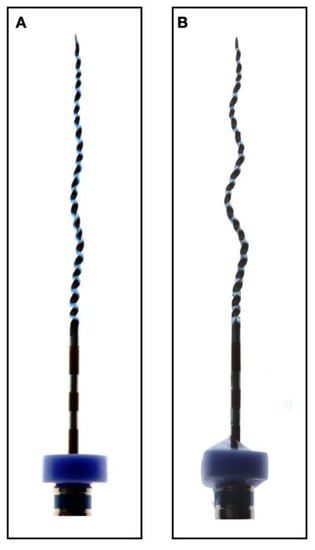 Temperature-dependent shape transition of the XP-endo Shaper. (A) XP-endo Shaper file at room temperature (20 °C); (B) the same file at body temperature (35 °C). The extremely flexible file will push itself into canal recesses not reachable by rotary NiTi files.